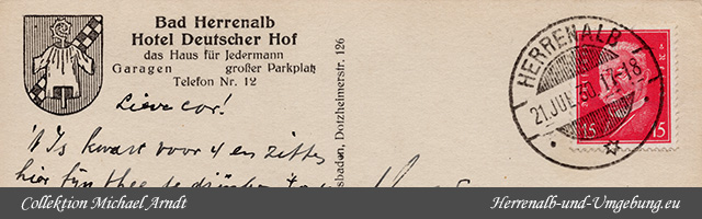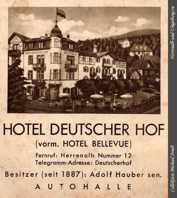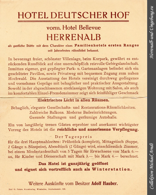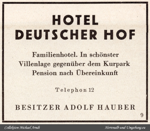 Das HOTEL DEUTSCHER HOF ist ein preiswertes Familienhotel in bevorzugt freier, schönster Villenlage, im Mittelpunkt des neueren Stadtteils, unmittelbar beim Kurpark, das nächstgelegene Hotel beim Bahnhof und beim Postamt. Das Haus ist von jeher ein Aufenthaltsort für gute Gesellschaftskreise gewesen. Von hier aus genießt man den schönsten Rundblick auf die wald- und berggeschmückte Landschaft, sowie auf die unmittelbar gegenüber sich emporreckende, geologisch höchst interessante Felsenpartie des Falkenstein. |